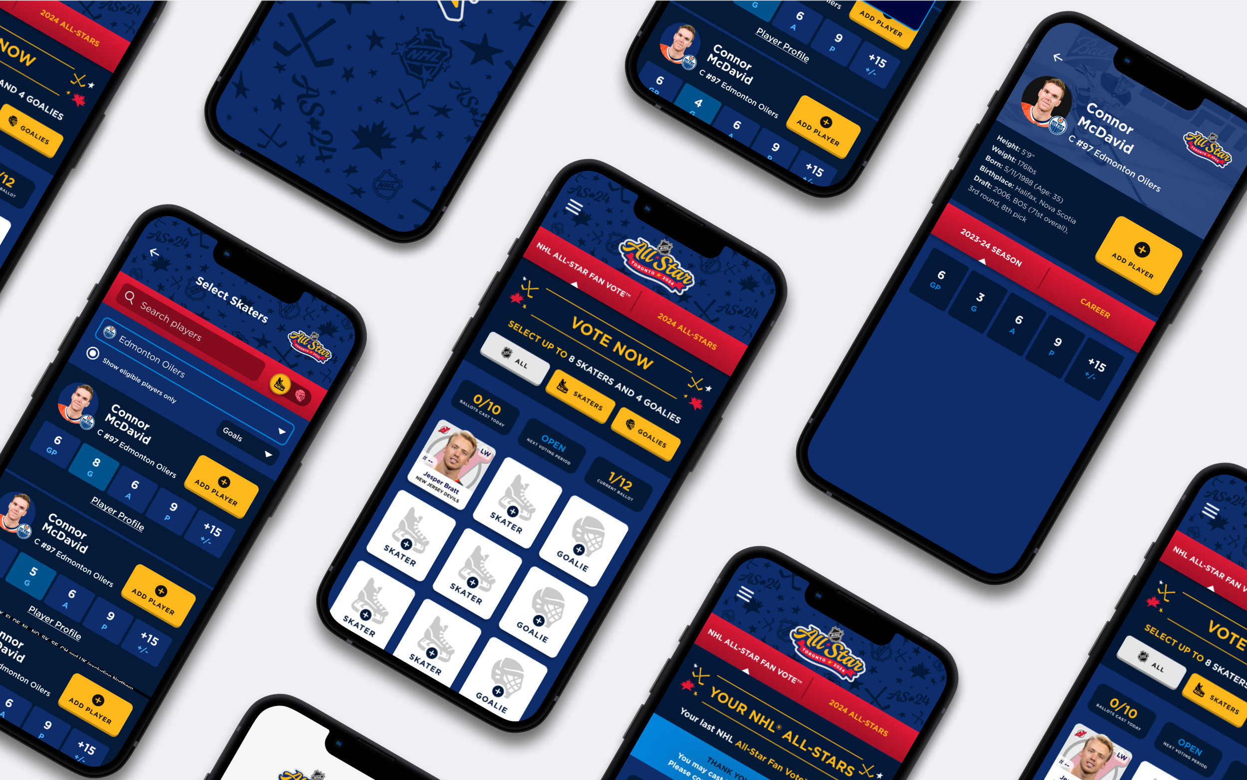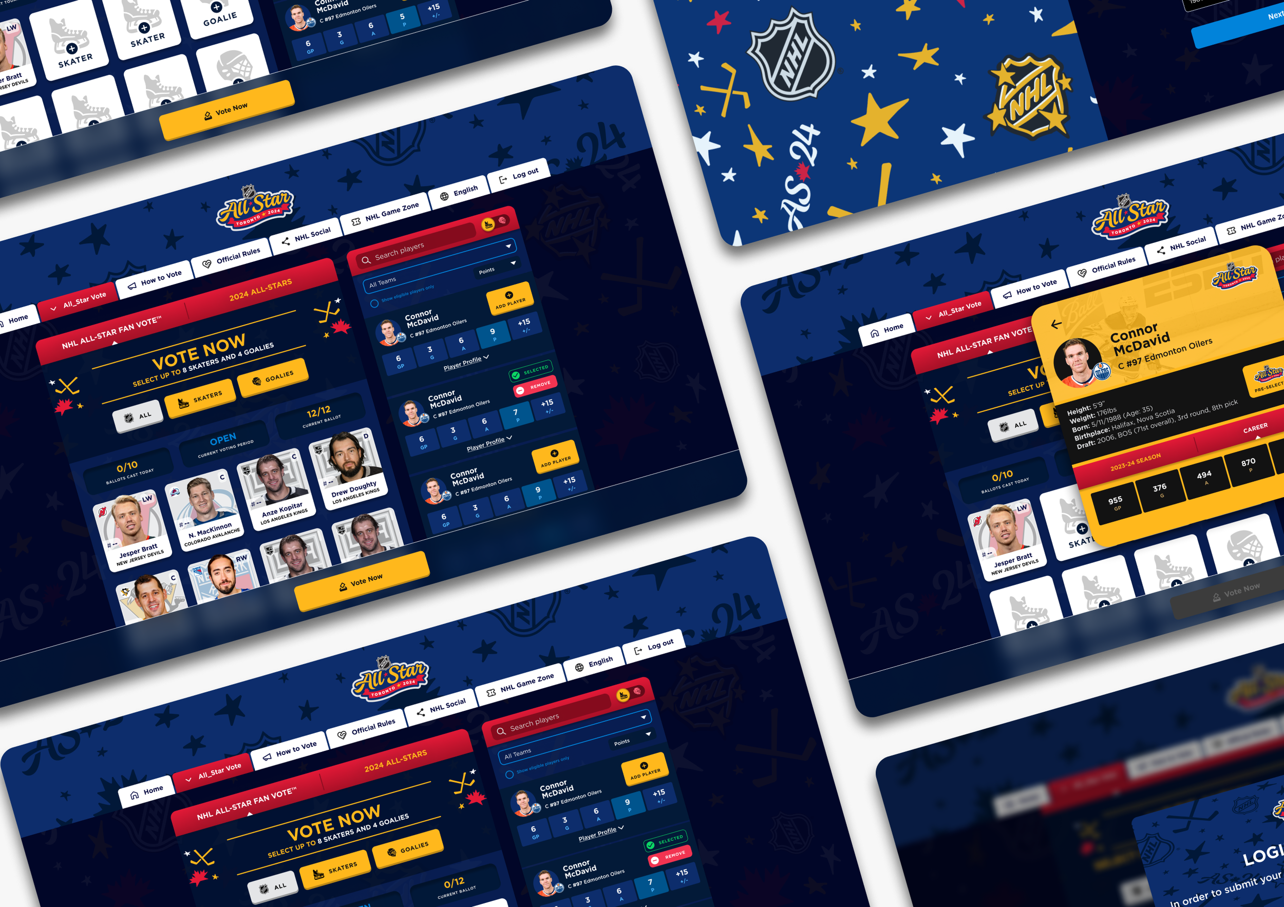 The NHL All-Star Fan Vote was designed as an interactive voting experience that allowed fans to actively participate in team selection by building their own All-Star line-ups. Through a drag-and-drop interface, users could select players and create personalised rosters, transforming a traditionally passive voting process into a more engaging and hands-on experience.