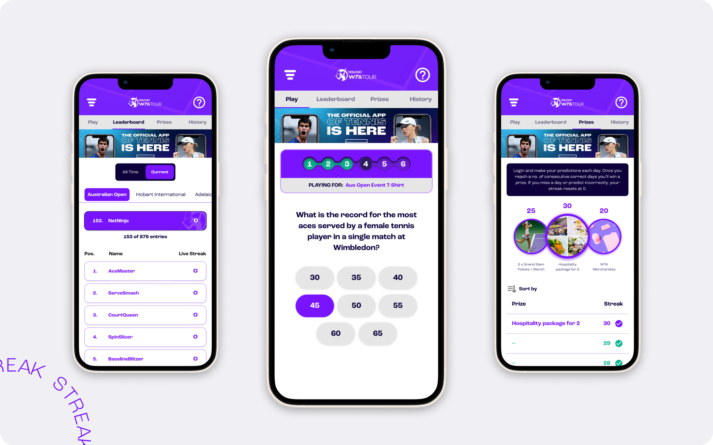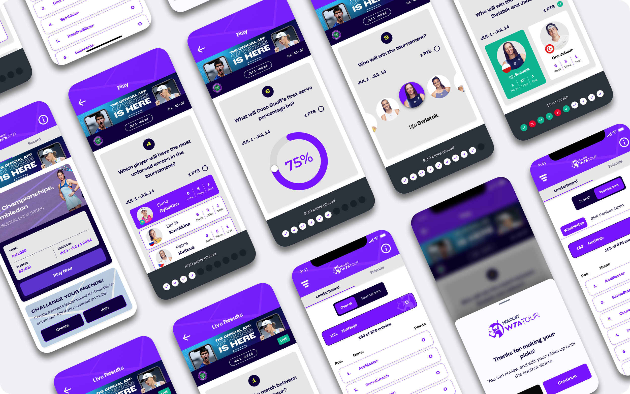 In response, we designed a Pick’em and Streak-based game aligned with the WTA tournament calendar. The experience allowed users to predict match outcomes through a series of questions, encouraging participation both before and during live events. To support engagement and retention, we introduced session-based and overall leaderboards, giving users clear feedback on performance and incentivising repeat interaction across multiple tournament stages.