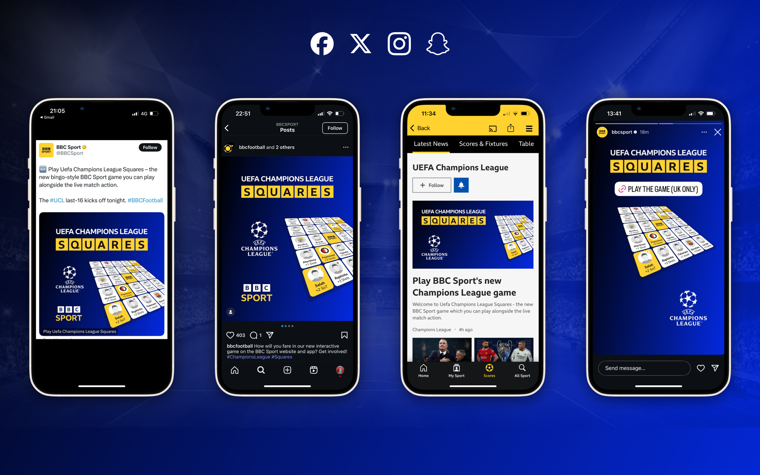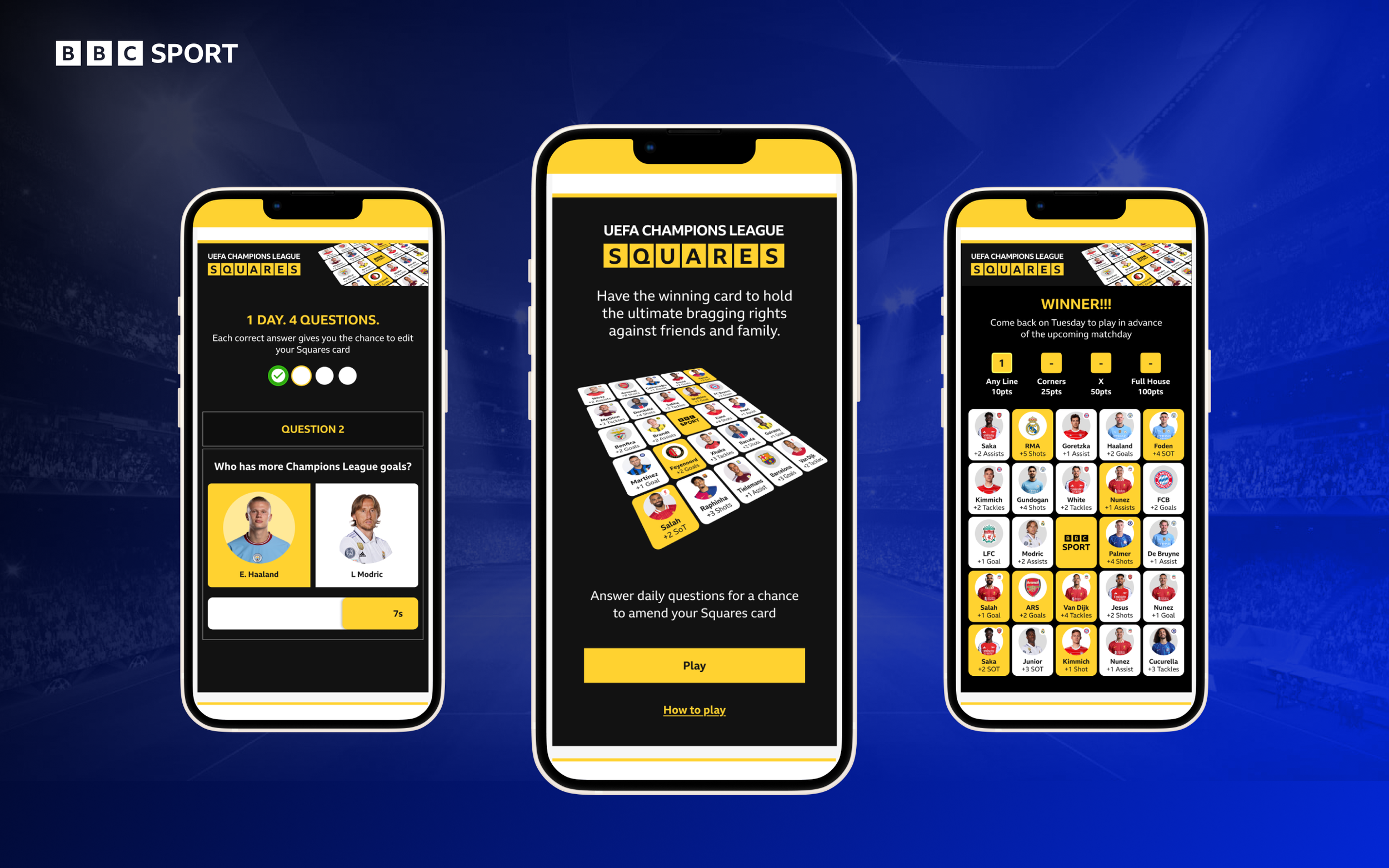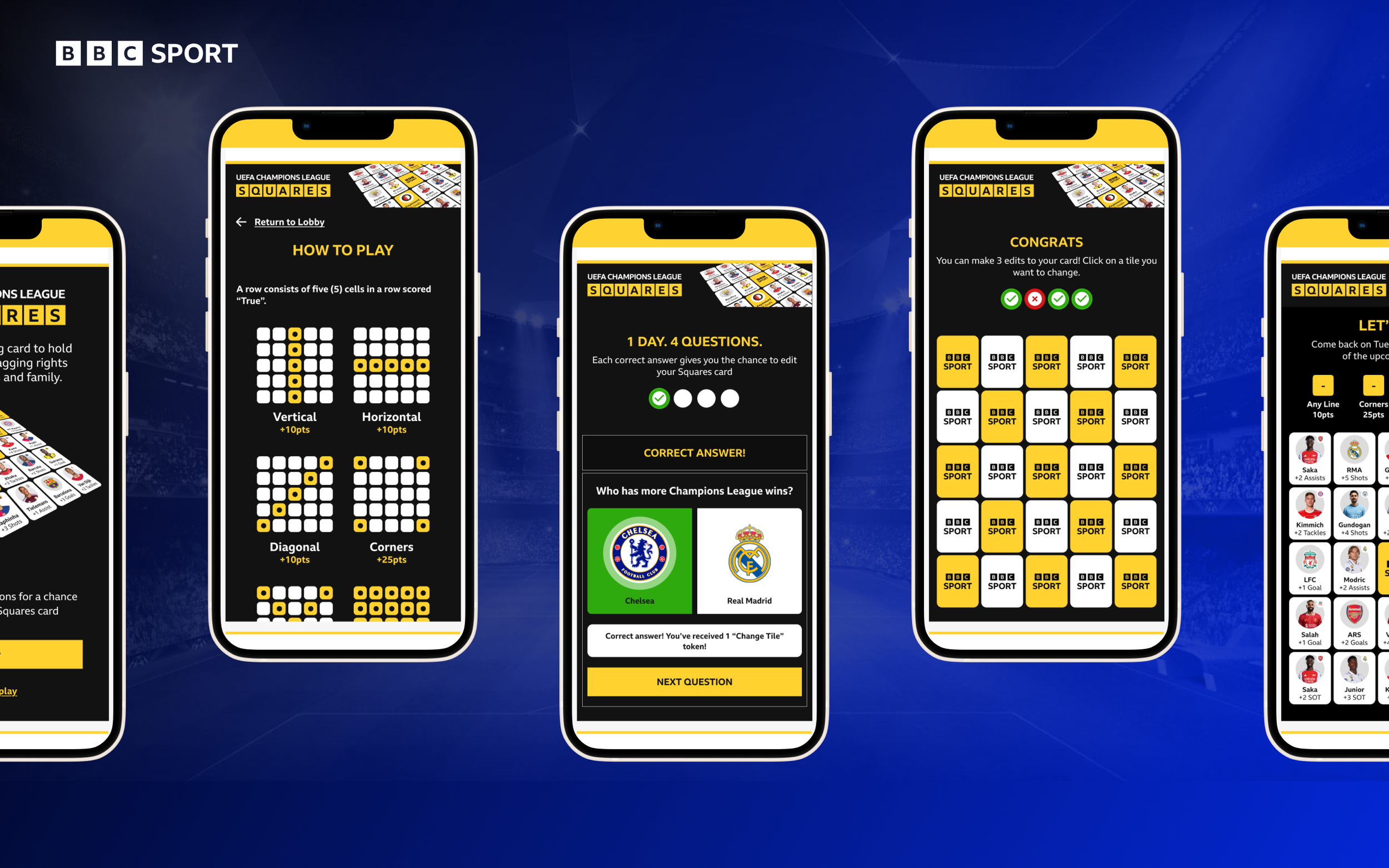 In collaboration with BBC Sport, we designed and delivered a gamified “Squares” experience for the UEFA Champions League. The product aimed to complement live match broadcasts by giving fans an interactive, second-screen experience tied directly to in-game moments.
